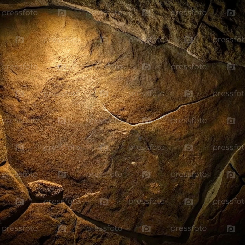 Близкий взгляд на грубую каменную стену в темной комнате, освещенную одним источником света