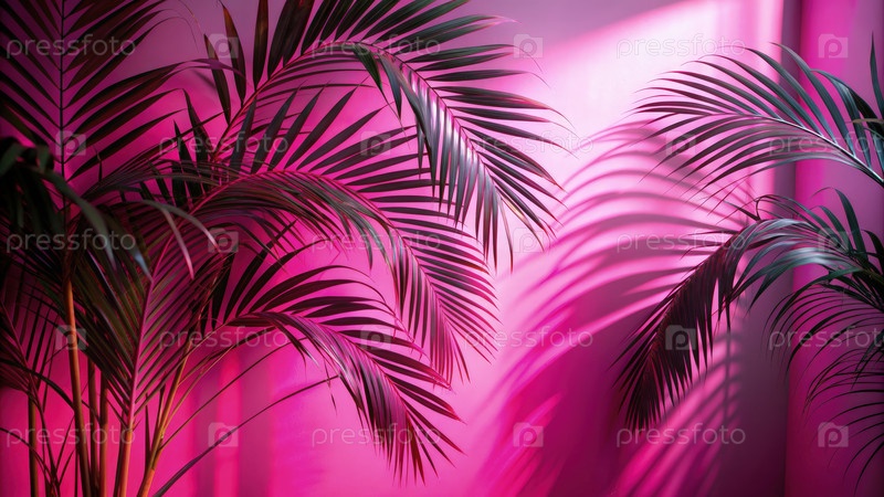 Тени пальмовых листьев на розовой стене в солнечной комнате