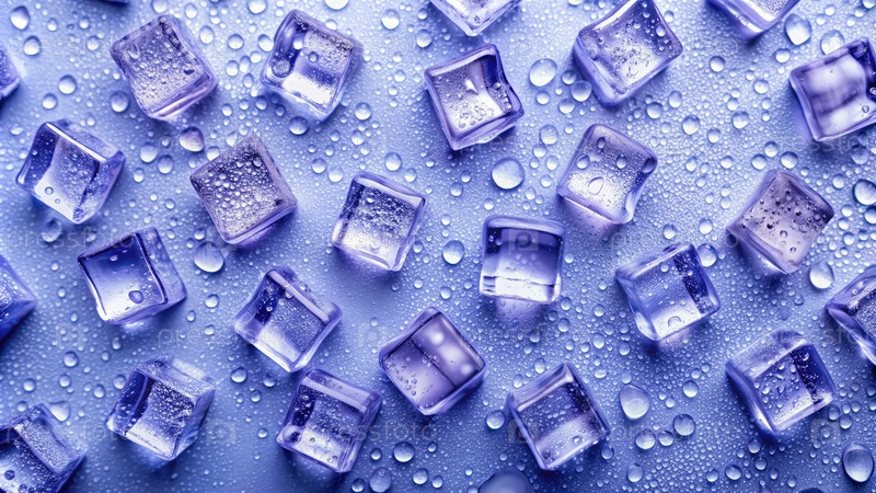 Наземный вид кубиков льда на влажной фиолетовой поверхности
