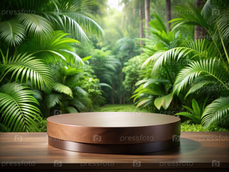 Деревянный подиум в пышной тропической джунгли. генеративная ИИ