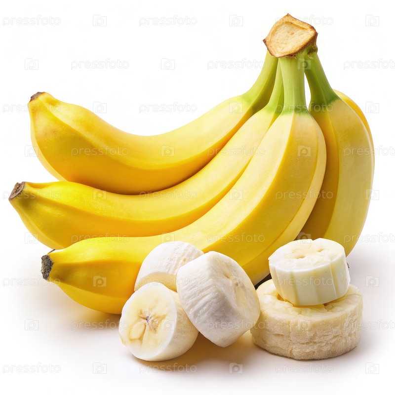 Зрелые желтые бананы с кремообразными белыми ломтиками на белом фоне