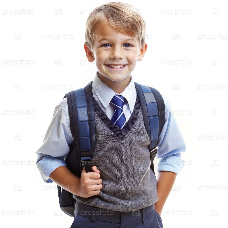 Улыбающийся мальчик в школьной форме и рюкзаке на белом фоне