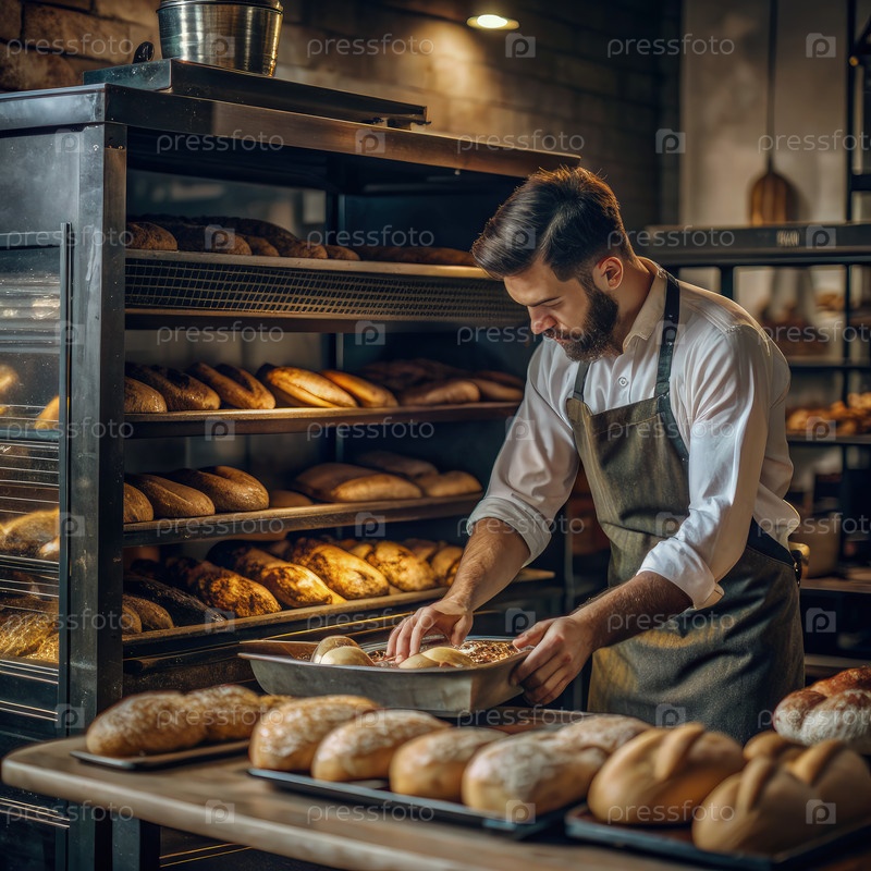 Пекарь устраивает свежевыпеченный хлеб в уютной пекарне