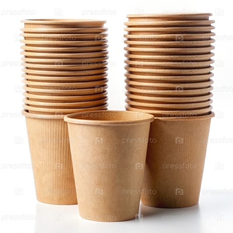 Стака коричневых бумажных чашек на белом фоне
