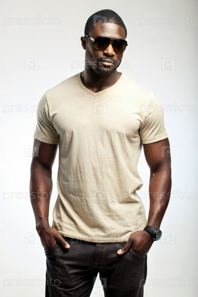 Человек в солнцезащитных очках и кремовой футболке стоит с руками в карманах