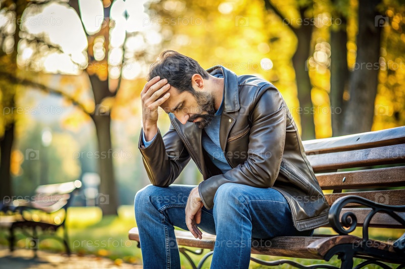 Человек с затрудненным выражением сидит на скамейке в Осеннем парке