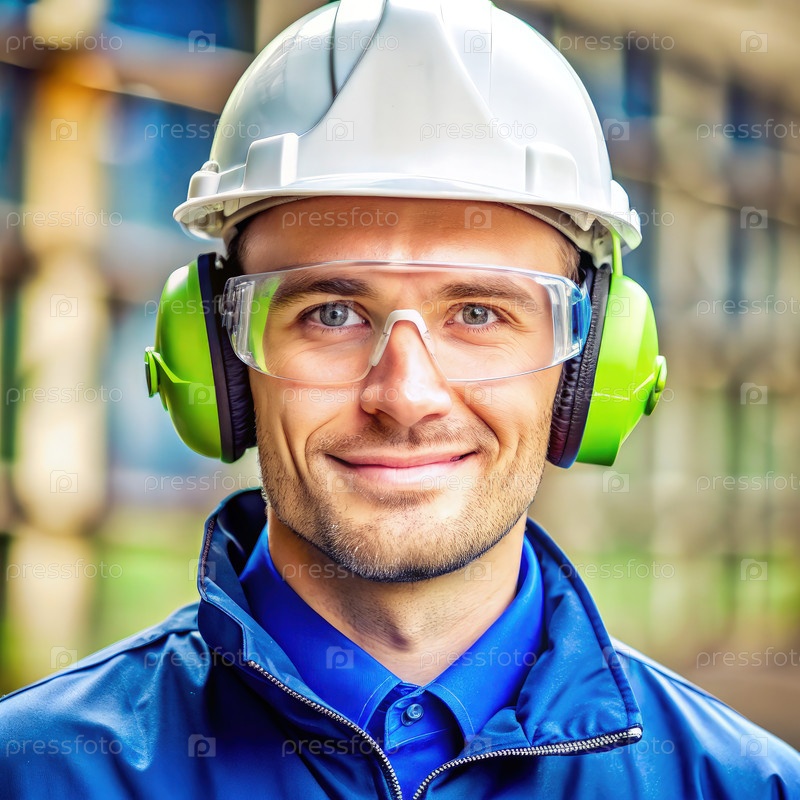 Красивый российский работник, носящий предохранительное снаряжение, улыбается камере в промышленной обстановке