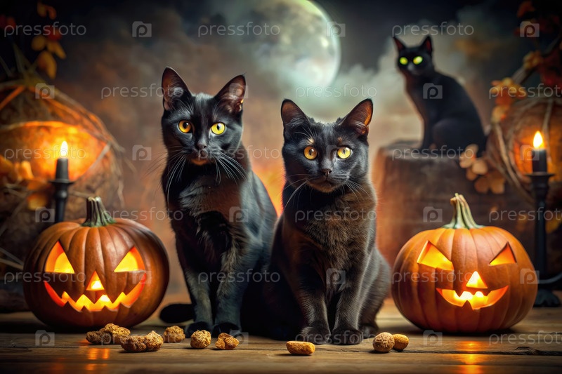 Черные кошки позируют с зажженными фонарями под полнолунием в ночь на Хэллоуин