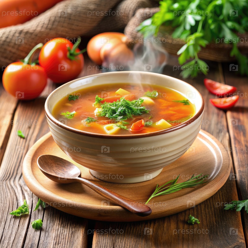 Паровая миска томатного супа с макаронами и петрушкой на деревянном столе