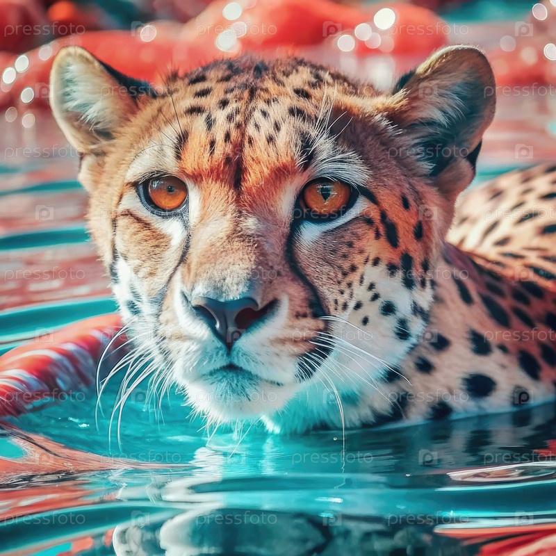 Гепард плавает в бассейне летом