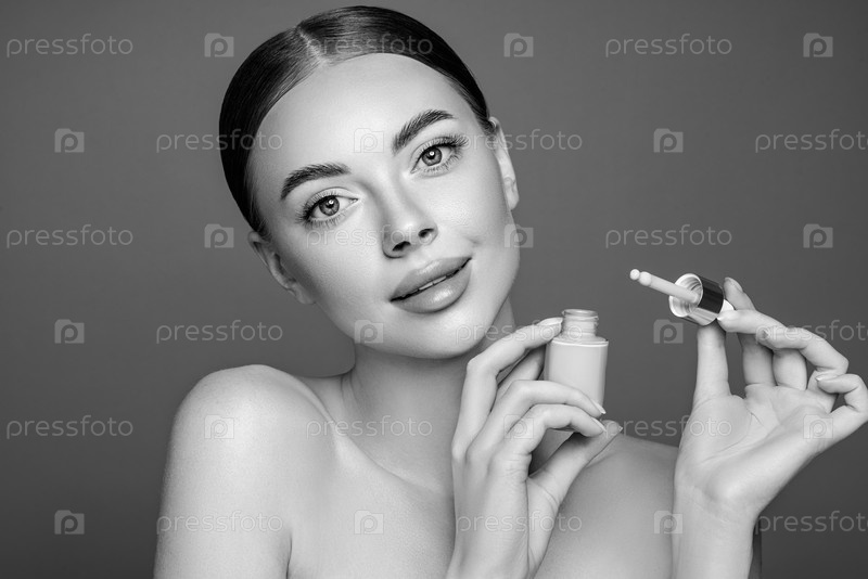 Портрет красивой молодой женщины с бутылкой основания