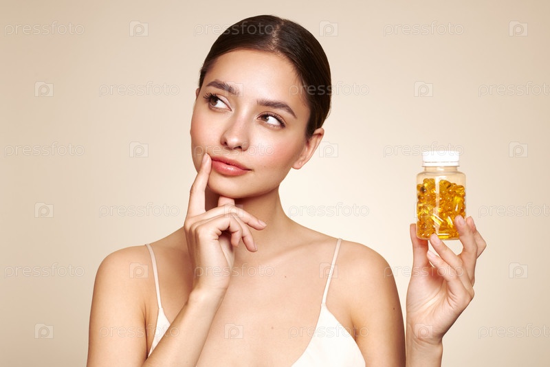 Красивая девушка с таблеткой с маслом печени трески Омега-3