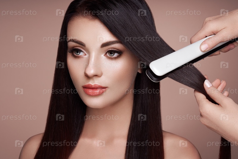 Парикмахерская выпрямляет длинные волосы железками