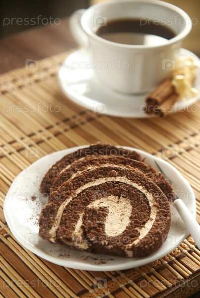 Шоколадный вкусный рулет с кофе и корицей на столе