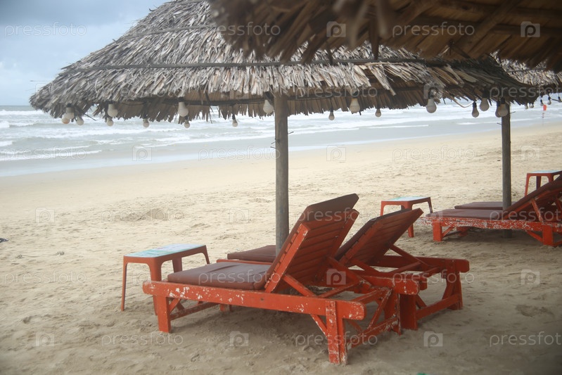 Пейзаж с видом на песчаный пляж, лежаки и волны
