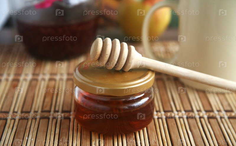 Сладкий мед в банке и машлка лежат на столе, крупный план