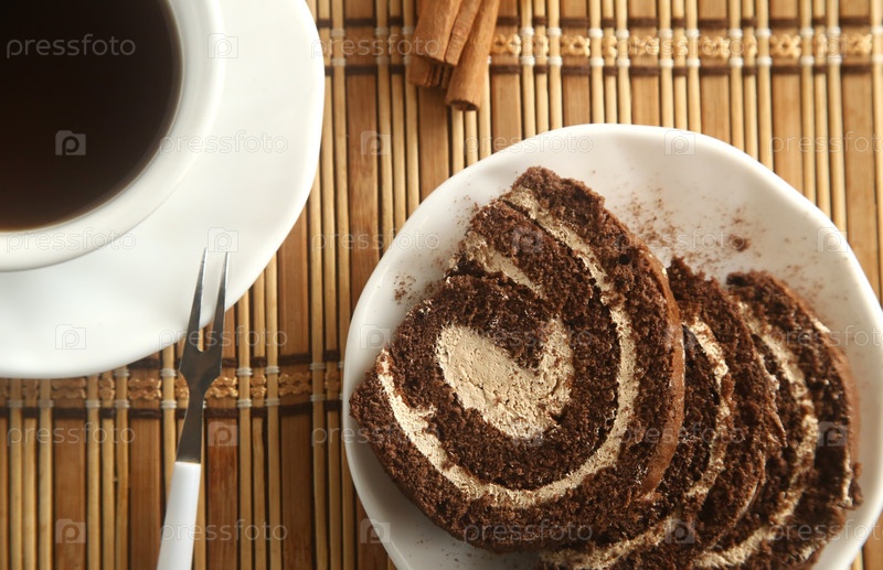 Шоколадный рулет с черным кофе и корицей на столе, вид сверху