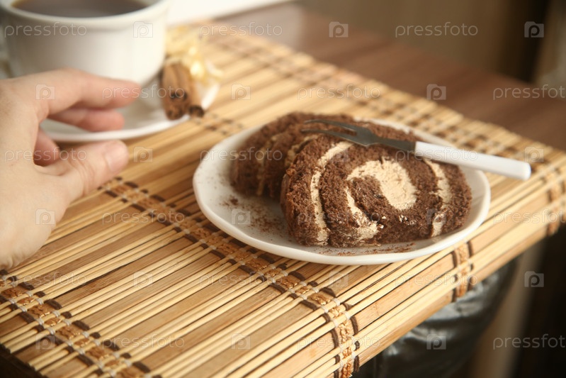 Шоколадный рулет с кофе и корицей на столе, вид сверху