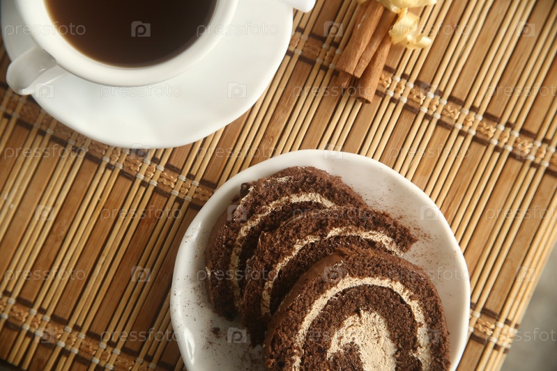 Шоколадный рулет с кофе и корицей на столе, вид сверху