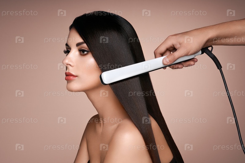 Парикмахерская выпрямляет длинные волосы железками