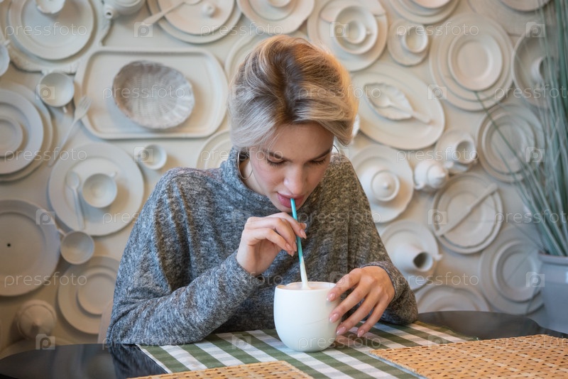 Красивая молодая женщина сидит в кафе возле окна с белой чашей