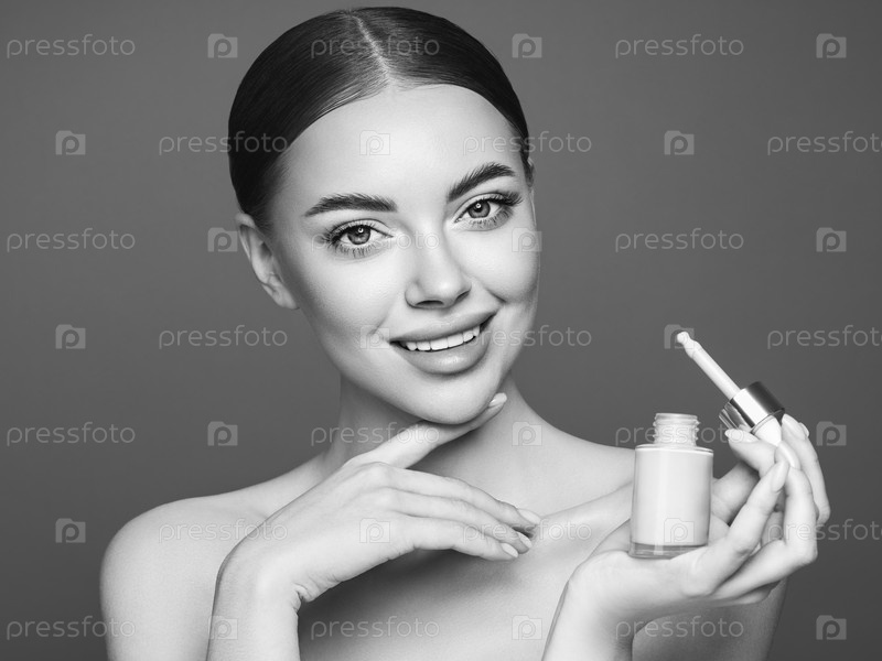 Портрет красивой молодой женщины с бутылкой основания