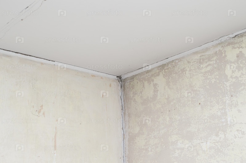 Угол комнаты с трещинами на стенах и потолке