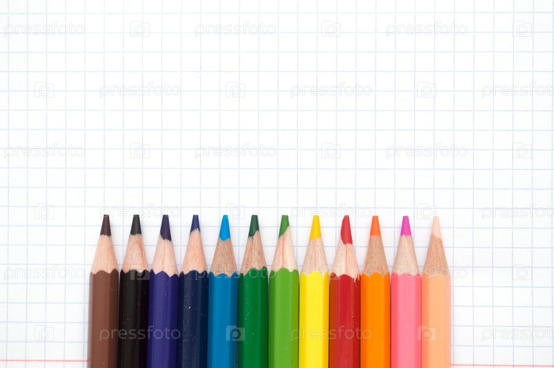 Ряд цветных карандашей на фоне в клеточку