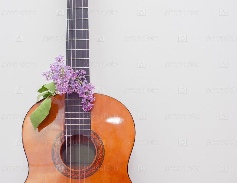 Классическая гитара, украшенная веточкой сирени на белом фоне