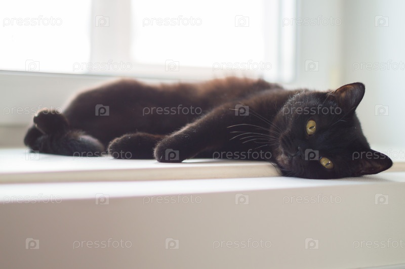Черная кошка лежит на подоконнике