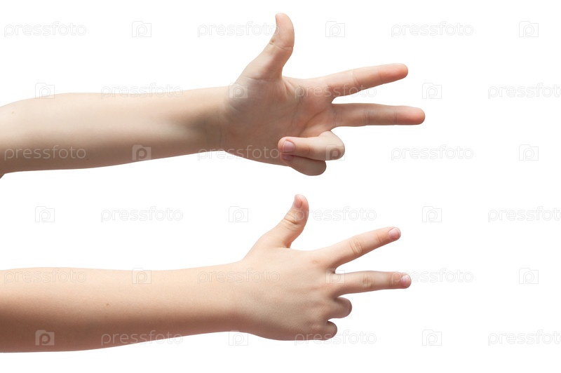 Рука ребенка показывает знак два на белом фоне