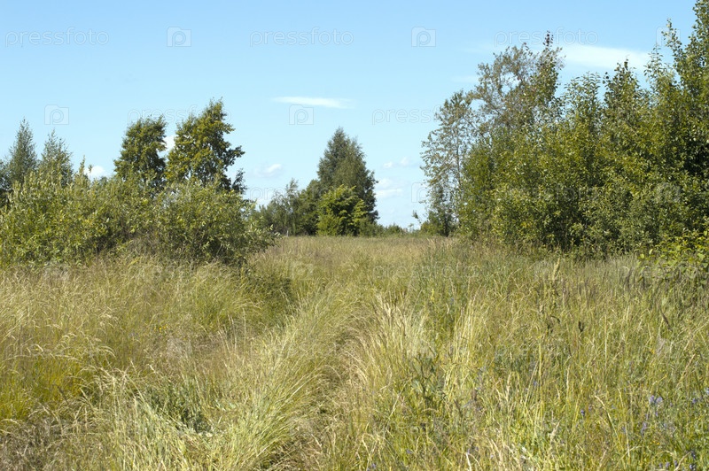 Зеленое поле с деревьями и кустарниками. Природа средней полосы России