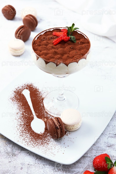 Тирамису-десерт в высоком стекле. изысканное представление. итальянский многослойный десерт с сыром маскарпоне. штанцевка в форме ложки, выполненная из какао