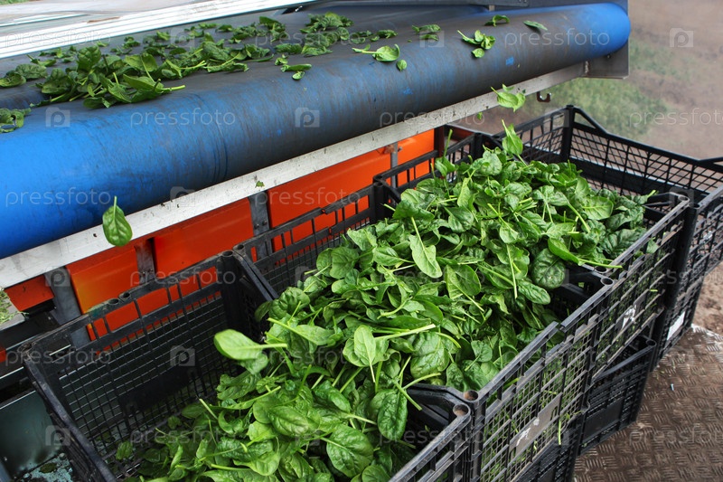 Автоматическая уборка листьев шпината. Плантация шпината. Свежий урожай зеленых листьев шпината. Уборка осенью. Ферма для выращивания органического шпината. Органические вегетарианские продукты. Сельскохозяйственная промышленность. Работа на земле