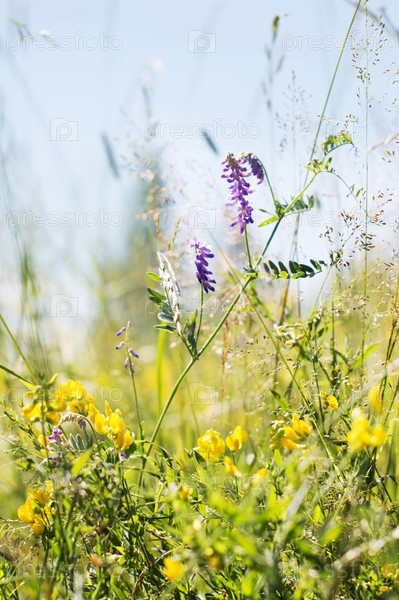 Яркие полевые цветы в траве крупным планом