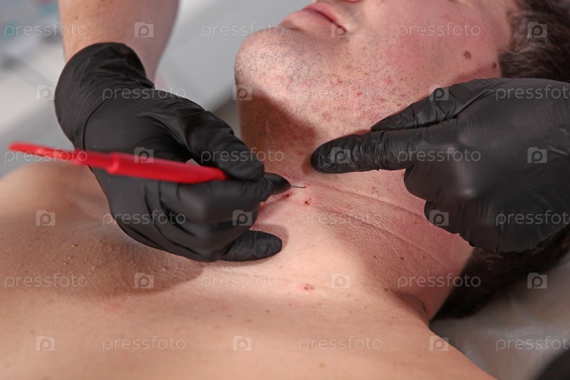 Врач, удаляющий многие небольшие папилломы с помощью лазера на теле мужчины, ожоги кожи, ближайший взгляд. Косметическая процедура. Удаление невуса, родинки, папилломы или родимого пятна. Концепция однодневной операции