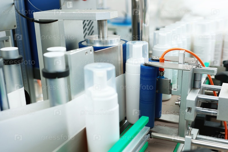 Конвейерная лента с пластиковыми бутылками для производства косметики. Бутылки без этикеток перемещаются вдоль конвейера. Машина для наклеивания и маркировки