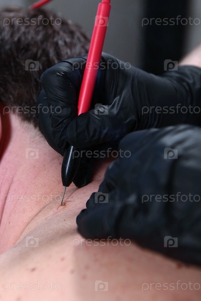 Хирург удаляет многие мелкие папилломы с помощью лазера на теле человека, жжение кожи, близкий взгляд. Удаление невуса, молы, папилломы или родинки, хирургическая процедура. Концепция операции в один день