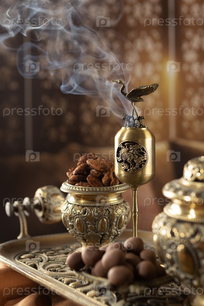 Праздник Рамадан. Сжигатель для фимиам. Праздничная открытка, приглашение на мусульманский священный месяц Рамазан Карим. Темный фон. Свободное место для копирования