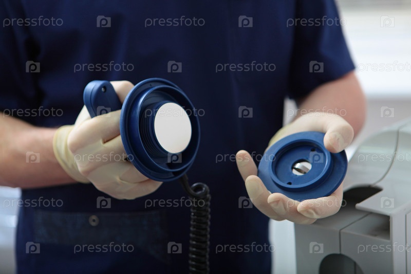 Дефибриллятор в руках реаниматора. Выпускные электроды в руках врача интенсивной терапии. Интенсивная помощь. Электроимпульсная терапия сердечных аритмий. Спасание жизни пациента