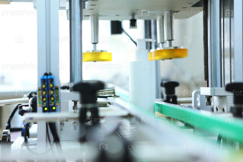 Машина для маркировки. Белые пластиковые бутылки без ярлыков на конвейерной ленте. Конвейерная лента для производства косметики. Производство косметики и средств по уходу за кожей