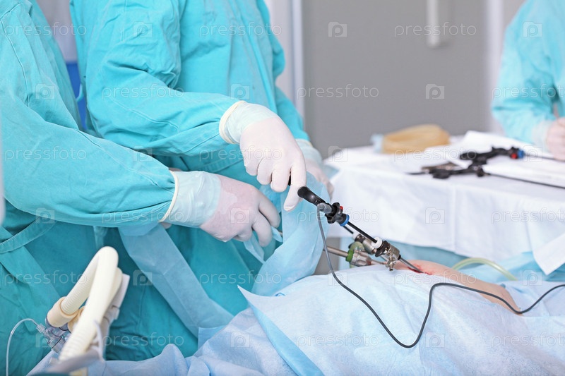 Лапароскопические инструменты в руках хирурга. Современная брюшная хирургия. Лапароскопия в хирургии. Хирургическая команда. Хирургическое вмешательство через небольшие отверстия