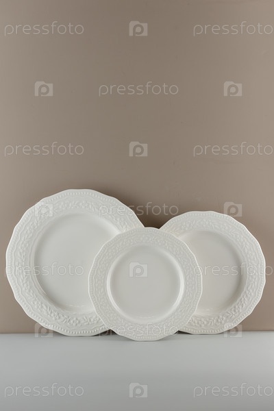 Набор белых фарфоровых тарелок разных размеров на бежевом фоне. Некоторые пустые белые столовые тарелки на бежевом фоне. Лайм-аут для размещения рекламной информации и маркетинговых объявлений. Карта продукта