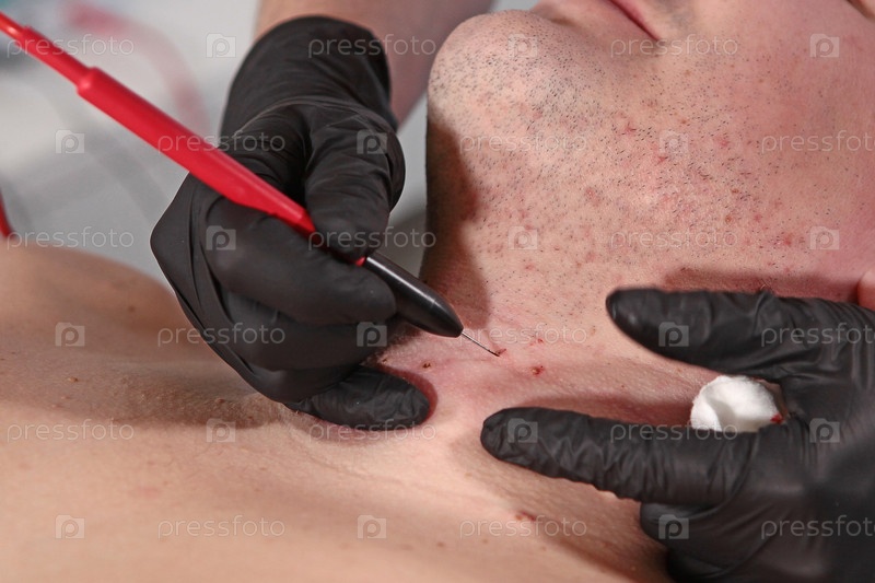Врач удаляет многие небольшие папилломы с помощью лазера на теле мужчины, ожоги кожи, ближайший взгляд. Косметическая процедура. Концепция однодневной операции. Удаление невуса, родинки, папилломы или родимого пятна