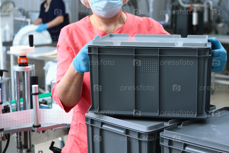 Работник держит в руках пластиковую коробку на косметической фабрике.Оконченные продукты в пластиковой коробке. Конвейерная лента на заднем плане не сфокусирована