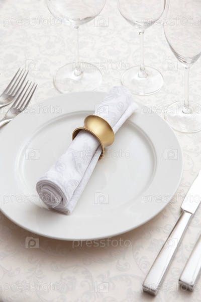 Установка праздничного стола. На тарелку помещается белая салфетка с желтым металлическим кольцом. Пустые бокалы для напитков. Подготовка к приему гостей. Концепция праздничных мероприятий