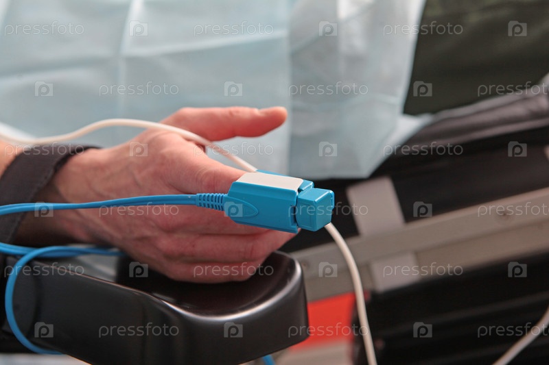 Датчик артериального давления установлен на пальце мужчины.Пулсоксиметр для мониторинга уровня кислорода в крови и частоты пульса.Кросс-схема.Фотография в операционной