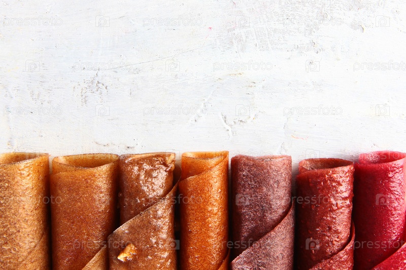 Таблетки в ассортименте. Веганские сладости. Вид фруктовой пасты. Естественный продукт. Фруктовая кожа на кусочках (пастила).Красивые рулоны плодовой кожицы как фон. Фотографии для статей о здоровом питании
