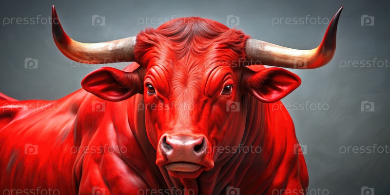 Жестокий красный бык с большими рогами стоит на сером фоне