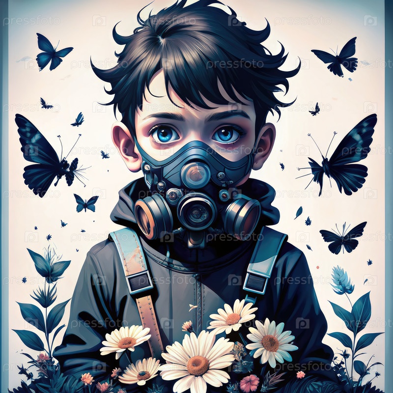 Мальчик с газовой маской держит цветы, окруженные бабочками